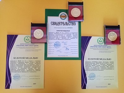 Члены жюри Международного конкурса-выставки METHODICE, в состав которого вошли представители России, Казахстана и Белоруссии и Всероссийского конкурса «РОСТОЧЕК: МИР СПАСУТ ДЕТИ» инновационных идей и проектов обучения, воспитания и развития детей дошкольного возраста под эгидой Международной славянской академии наук, образования, искусств и культуры высоко оценили актуальность работы по проблеме эффективного воспитания культуры ЗОЖ через приобщение воспитанников к народным традициям здоровьесбережения «Сундучок педагогических идей: «За здоровьем – вместе с народными традициями!», высокий профессионализм и креативность педагогов МБДОУ (авторы – Завьялова Н.Э., Плешкова Т.Н., Ксенофонтова А.В., Мамлева Н.А., Голубева И.А.), отметив представленный материал золотыми медалями.
