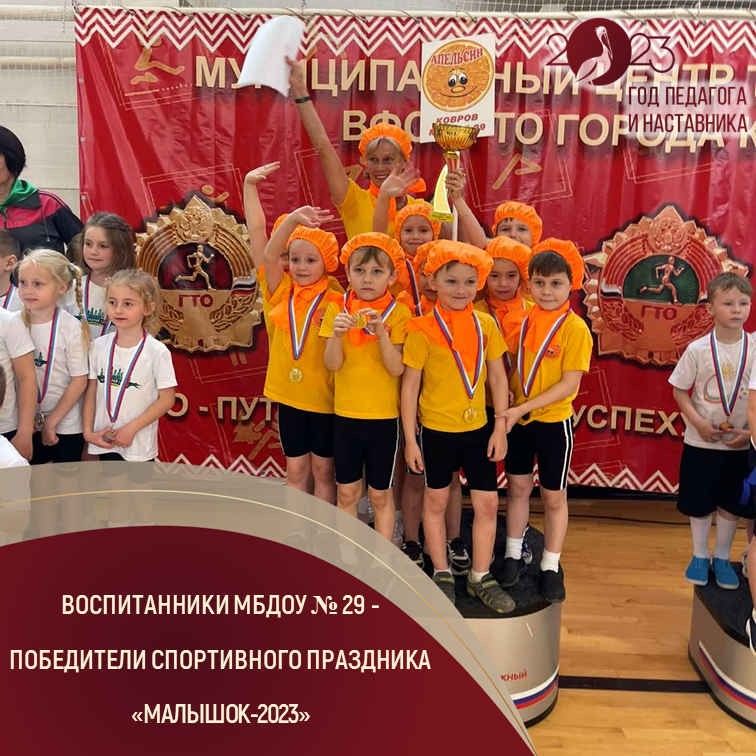 11 мая в МАУ СШ «Комплекс Молодежный» прошел финальный этап городского культурно-спортивного праздника «Малышок-2023» среди муниципальных дошкольных образовательных учреждений. Честь МБДОУ № 29 защищали юные спортсмены команды «Апельсин» (Богданова Дарья, Благов Никита, Борисова Анна, Зайцев Дмитрий, Мольков Всеволод, Самыгина Ульяна, Сидорова Маруся, Седов Константин, Устинов Михаил) под руководством инструктора по физической культуре Мамлевой Натальи Арсентьевны, педагога высшей квалификационной категории имеющей звание «Почетный работник общего образования Российской Федерации».